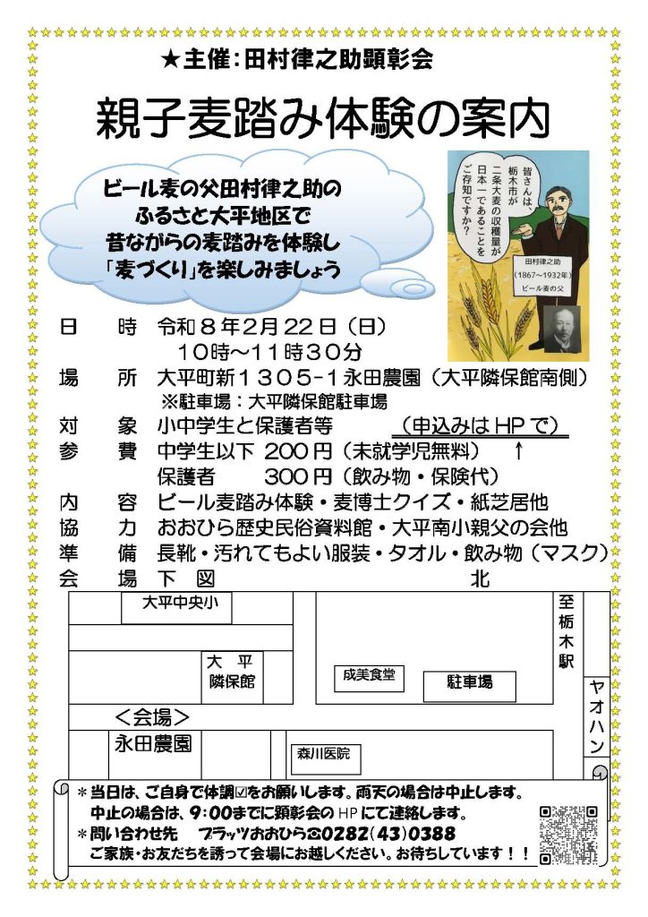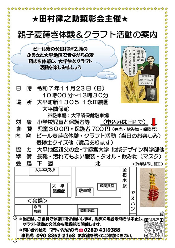 ビール麦の父 田村律之助の ふるさと大平地区 で昔ながらの 麦蒔きを体験 し、大学生とクラフト活動 を楽しみましょう
